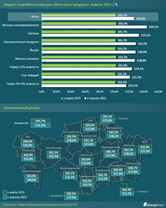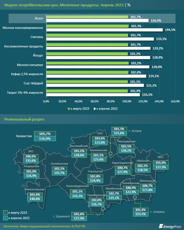 В годовой динамике наибольшее удорожание было отмечено для консервированного молока (на 44,5 процента), сметаны (на 33,5 процента), кисломолочных продуктов (на 29,2 процента), йогурта (на 28,9 процента, питьевого молока (на 28 процентов), кефира 2,5 процента жирности (на 24,1 процента), твёрдого сыра (на 21,2 процента) и творога 5%–9% жирности (на 16,1 процента).