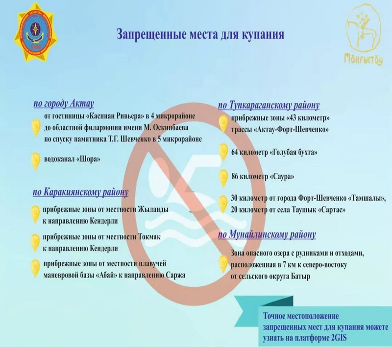 В Каракиянском районе прибрежные зоны от местности Жыланды к направлению Кендерли тоже и участок от местности Токмак к направлению Кендерли запрещены для купания.