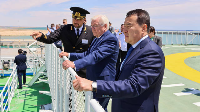 Делегация совершила пешую прогулку по территории Курыка и обзорную экскурсию на одном из паромов. Кроме того, Франк-Вальтеру Штайнмайеру и Алихану Смаилову были презентованы перспективные инвестиционные проекты, в том числе проект многофункционального морского терминала «Саржа», и представлены доклады о текущей работе порта.