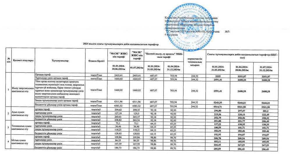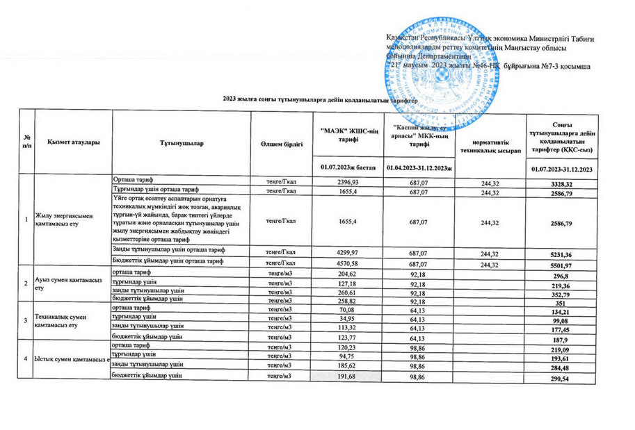- На основании приказа департамента Комитета по регулированию естественных монополий по Мангистауской области (ДКРЕМ по МО) № 46-ОД от 21.06.2023 года «Об утверждении временного компенсирующего тарифа на регулируемую услугу по подаче воды по магистральным трубопроводам (питьевой воды) ТОО «МАЭК» приказом №88-п от 29.06.2023 г. утвердило временный компенсирующий тариф на питьевую воду по магистральным трубопроводам с вводом в действие с 01.07.2023г. по 30.06.2024 г., - говорится в сообщении администрации ТОО «МАЭК».