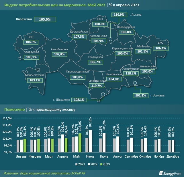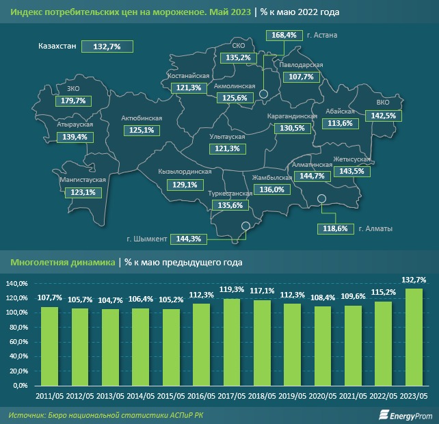 В разрезе регионов самый высокий годовой рост цен на мороженое наблюдался в Западно-Казахстанской области - на 79,7 процента.