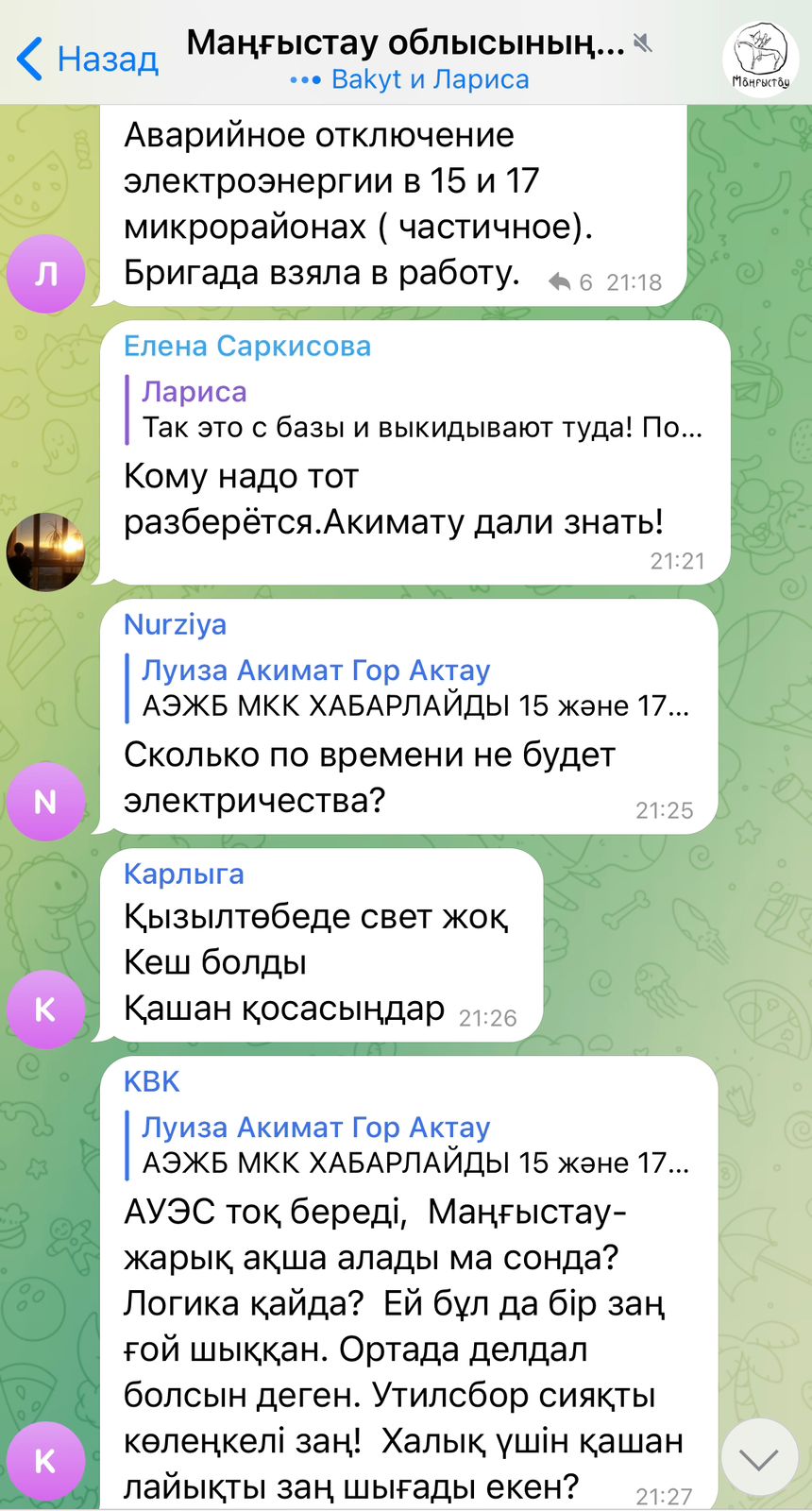 Жители домов в 15, 17, 11 микрорайонах Актау, а также сельчане из Кызылтобе, сообщают о частичном отключении электроэнергии. Жалобы горожане оставляют в Telegram-чате акима Мангистауской области.