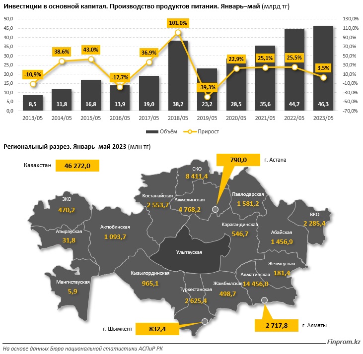 finprom.kz, инвестиции в основной капитал в сфере производства продуктов питания за январь–май 2023 года составили 46,3 миллиарда тенге, что в денежном выражении на 3,5 процента больше по сравнению с январём–маем 2022 года. Ранее три года подряд объём инвестиций в секторе в аналогичном периоде показывал годовой рост свыше 20 процентов.