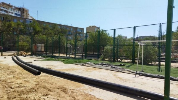 Уже больше месяца, по словам жителей дома №13 в 11 микрорайоне, как произошел порыв. Чтобы устранить проблему, коммунальщики убрали с нового футбольного поля половину резинового покрытия, ворота и сняли ограждения.