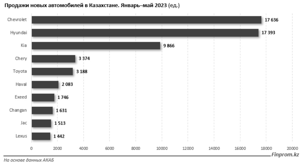 Қазақстандағы ең көп сатылатын автомобиль брендтері – Chevrolet (17,6 мың) мен Hyundai (17,4 мың) (отандық зауыттарда құрастырылады). Үшінші орында Kia (9,9 мың) орналасқан.