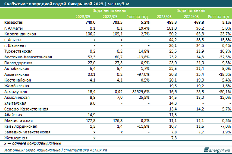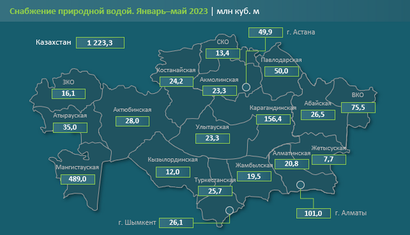 В региональном разрезе наибольший объём затрачивается в Мангистауской области: 489 миллионов кубометров (за один год плюс 0,2 процента). Наименьшие показатели были зафиксированы в Жетысуской области: 7,7 миллиона кубометров.