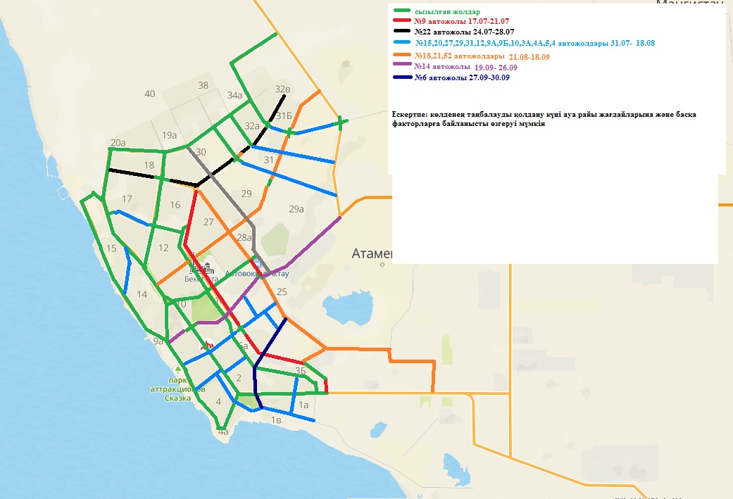- Заключен договор на содержание автомобильных дорог Актау. Подрядной компанией ведутся работы по нанесению дорожных разметок согласно утвержденной схеме в дневное и ночное время суток. Работы завершатся в сентябре текущего года, - сообщили в городском отделе пассажирского транспорта и автомобильных дорог.