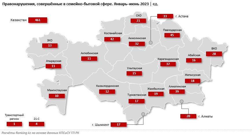На второй строчке антилидерства расположилась Костанайская область: 42 случая, плюс 5% за год. Далее идёт Алматинская область: 39 случаев против 56 случаев годом ранее, годовое сокращение - на 30,4%. В пятёрке регионов с наибольшим количеством уголовных правонарушений в семейно-бытовой сфере также оказались Карагандинская область и Астана: 37 и 33 случая соответственно.
