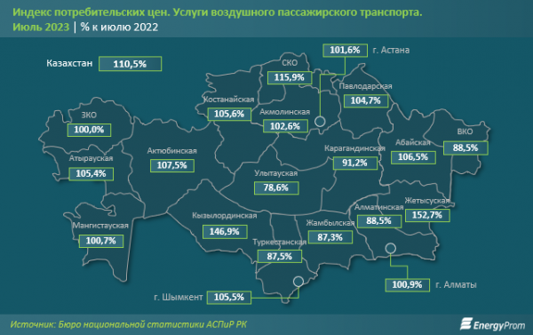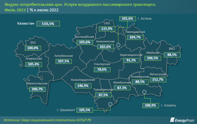 В Мангистауской области цены остались почти на уровне прошлого года (плюс 0,7 процента). Еще в шести из 20 регионов страны - в Карагандинской, Алматинской, Восточно-Казахстанской, Туркестанской, Жамбылской и Улытауской областях - услуги воздушного пассажирского транспорта подешевели.