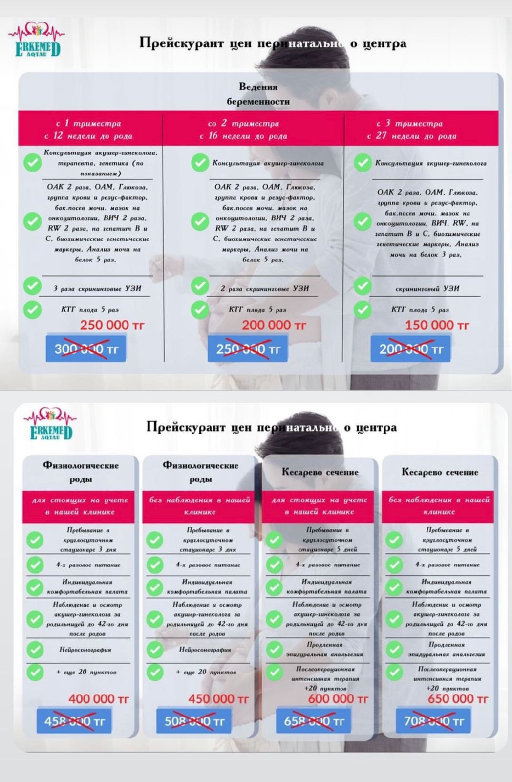 Стоимость платных родов зависит от категории и составляет от 400 000 до 650 000 тенге. Цена варьируется в зависимости от того, стоит женщина на учете по беременности в самой клинике или нет - для тех, кто доверил ведение беременности этой клинике, предусмотрена скидка.