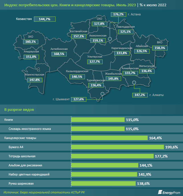 В региональном разрезе наибольший рост цен на книги и канцелярские товары наблюдался в Астане: на 76,2 процента за год. Удорожание также зафиксировали в Актюбинской (на 68,5 процента), Западно-Казахстанской (на 60,1 процента), Акмолинской (на 59,1 процента) и Восточно-Казахстанской (на 58,3 процента) областях.