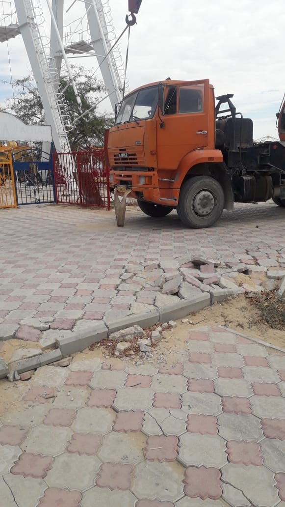 По словам горожан, сегодня, 25 августа, в парке «Акбота» при проведении работ по монтажу колеса обозрения, спецтехникой была разрушена тротуарная плитка.