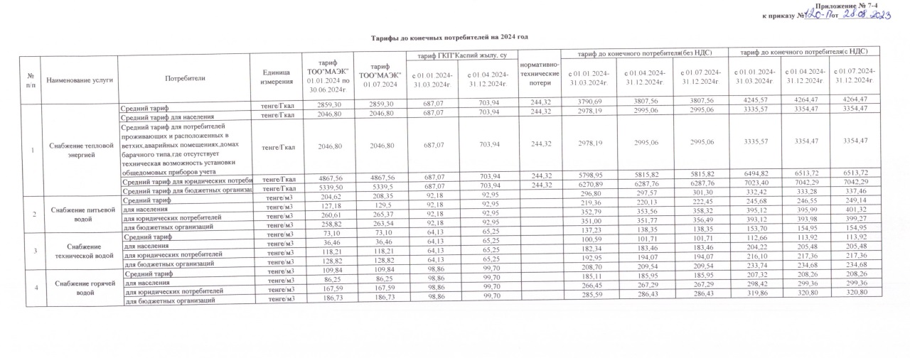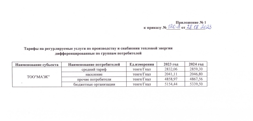 - ТОО «МАЭК» приказом № 120-п от 28.08.2023 года «О введении в действие тарифов и тарифных смет на регулируемые услуги по производству и снабжению тепловой энергии» вводит в действие утвержденный тариф с 1 сентября 2023 года, - сообщает пресс-служба предприятия.