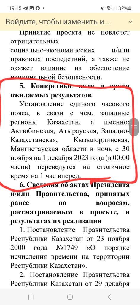 «Установление единого часового пояса в связи с чем, западные регионы Казахстана, а именно: Актюбинская, Атырауская, Западно-Казахстанская, Кызылординская, Мангистауская области в ночь с 30 ноября на 1 декабря 2023 года (в 00:00 часов) переведутся на столичное время на час вперёд».