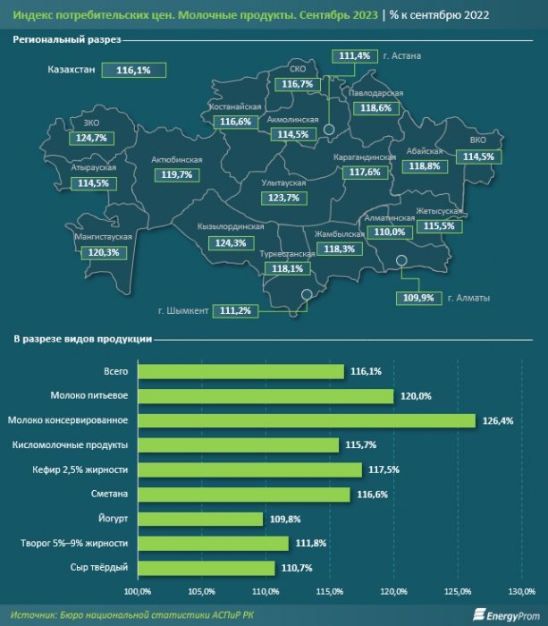 В региональном разрезе наибольший рост цен был отмечен в Западно-Казахстанской области: на 24,7 процента за год. В тройке антилидеров также оказались Кызылординская (плюс 24,3 процента за год) и Улытауская (плюс 23,7 процента) области. В Мангистау молочные продукты подорожали на 20,3 процента за год.