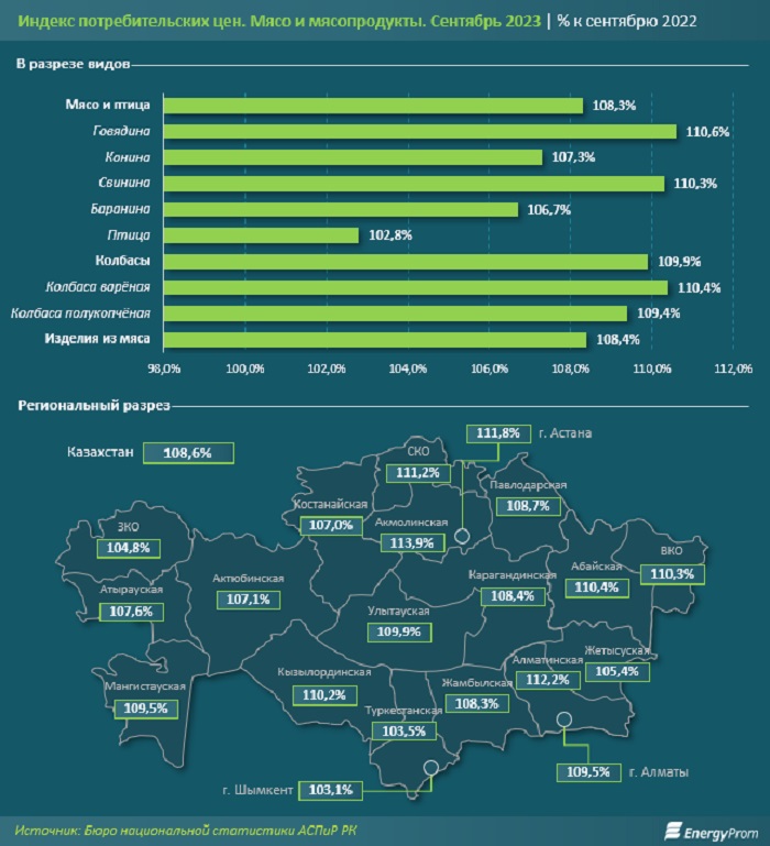 Energyprom.kz, в сентябре текущего года цены на мясо и мясопродукты по стране выросли на 8,6 процента за год. В том числе мясо и птица подорожали на 8,3 процента, колбасы - на 9,9 процента, изделия из мяса - на 8,4 процента.