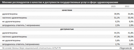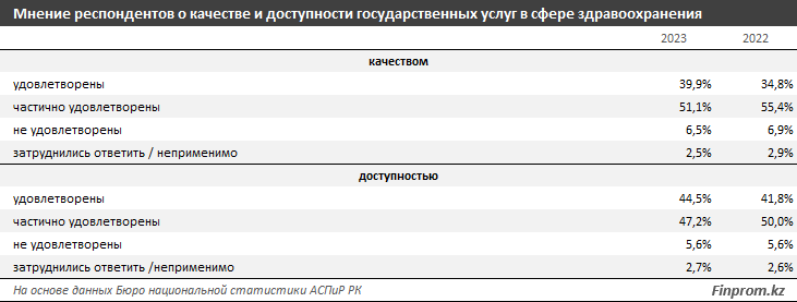 В то же время доля казахстанцев, удовлетворённых доступностью услуг в сфере здравоохранения, выросла до 44,5% (годом ранее — 41,8%). Частично удовлетворены были 47,2% респондентов. Уровень неудовлетворённости остался тем же, что и годом ранее: 5,6%. Затруднились ответить 2,7% казахстанцев.