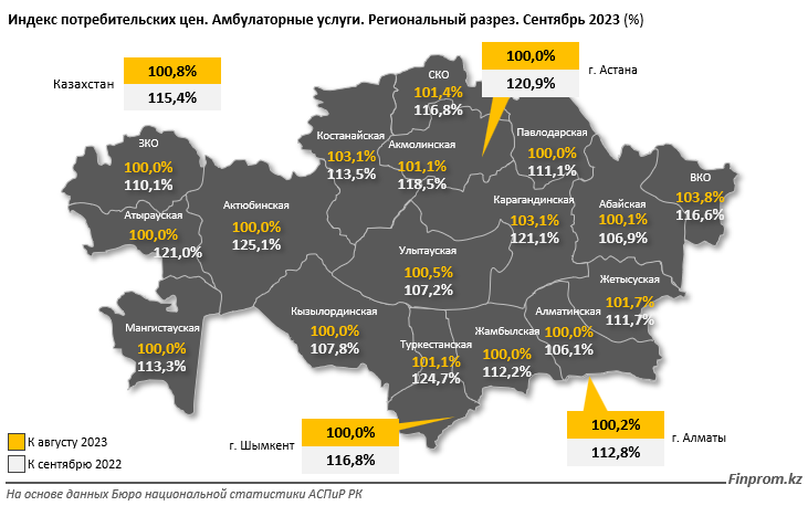 В региональном разрезе сильнее всего амбулаторные услуги подорожали в Восточно-Казахстанской области: на 3,8% за месяц/