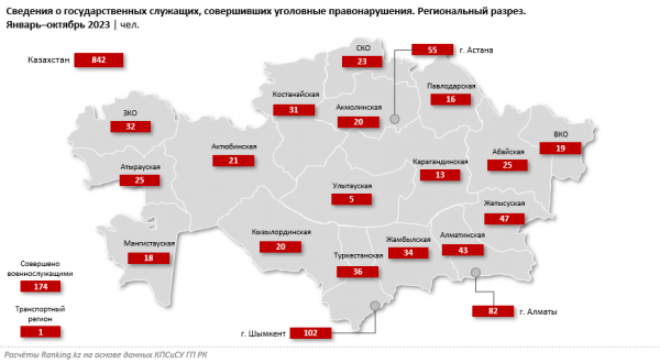 В региональном разрезе больше всего государственных служащих, совершивших уголовные правонарушения, насчитывается в Шымкенте, сообщают аналитики