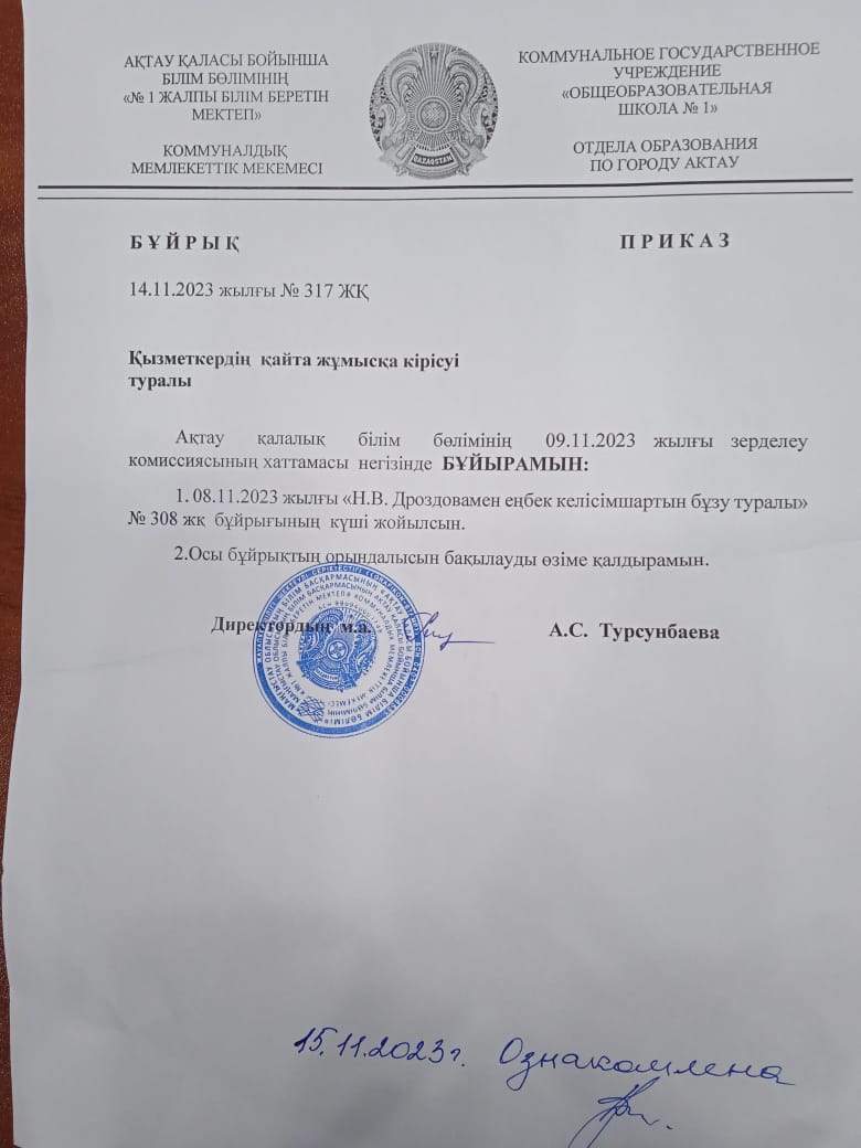 - Согласно Приказу №317 ЖҚ от 14.11.2023 года КГУ «Общеобразовательная школа №1» отдела образования по городу Актау учитель биологии Дроздова Н. В. приступит к своей работе. Также в отношении исполняющего обязанности директора данной школы будут приняты дисциплинарные меры, - заявили в отделе образования.