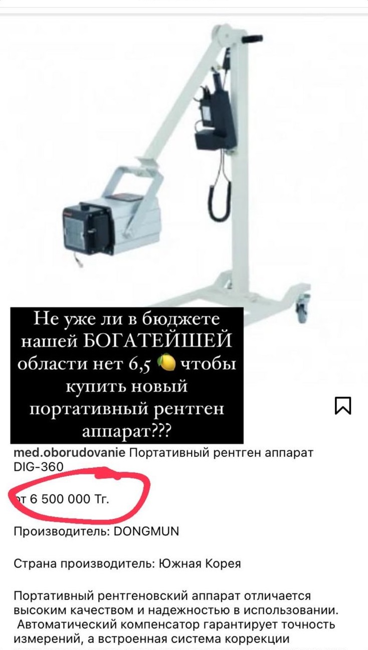 - Один единственный травматолог на весь Жетыбай, без элементарного оборудования спасает жизни. В больнице единственный аппарат рентгена, и как отметил врач, если он сломается, то он будет не врачевать, а шаманить. В больнице нет даже самых элементарных вещей. Часть оборудования хранится просто на подоконнике. Мой шок просто в шоке. Как в больнице, вокруг которой сотни нефтяных вышек, которые ежедневно качают тонны нефти, нет рентгена. Неужели, в бюджете нашей богатейшей области нет 6,5 миллиона тенге, чтобы купить новый портативный рентген аппарат, - написала жительница региона в социальной сети.