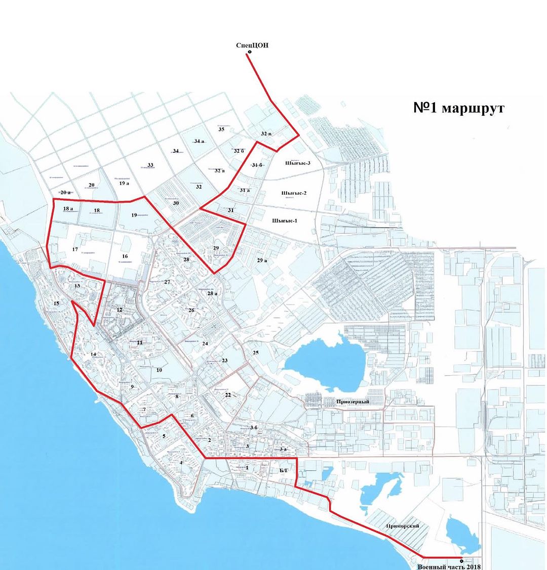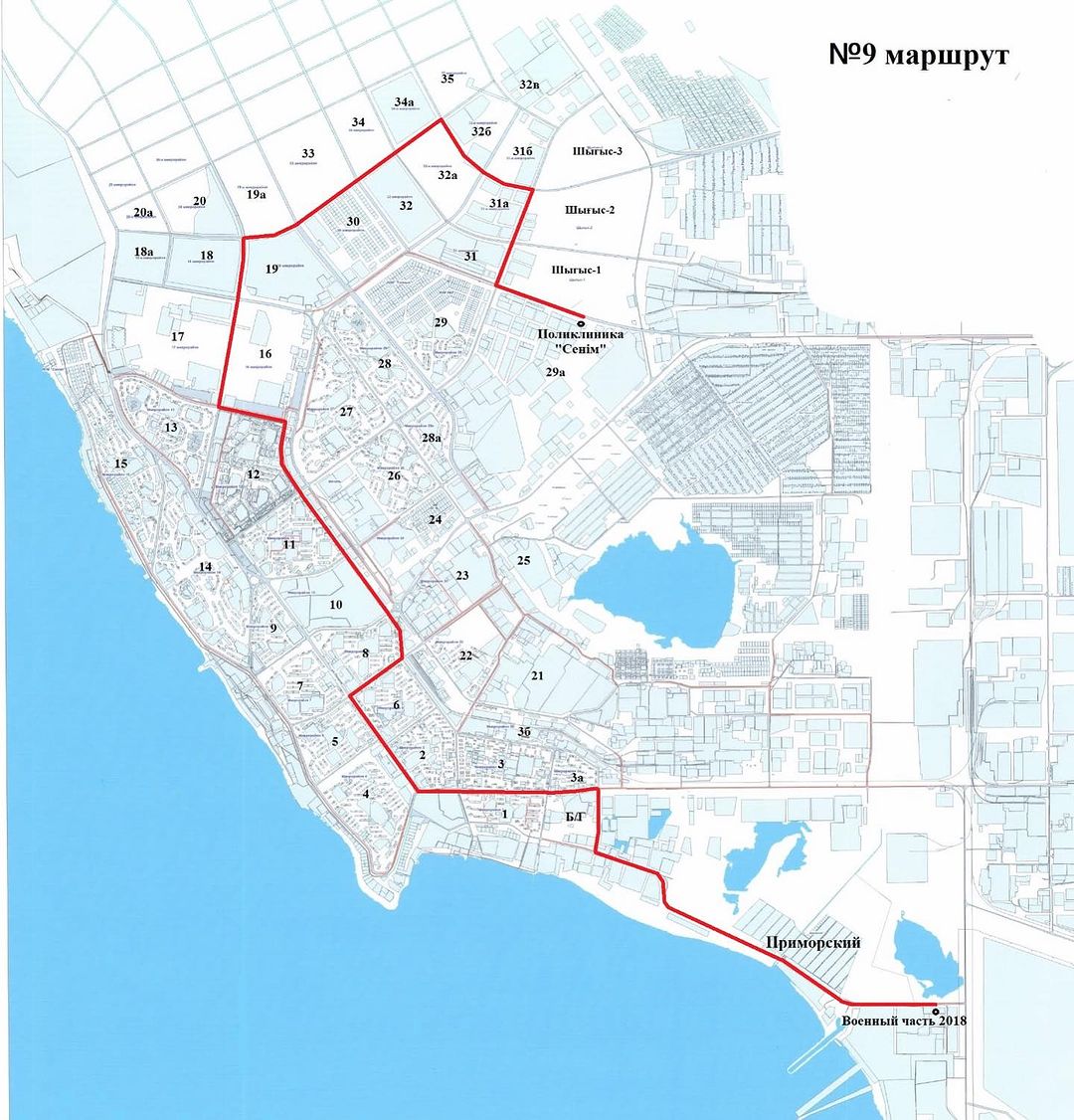 Маршрут №9 будет следовать от поликлиники «Сенім» в 29А микрорайоне до войсковой части №2018 в жилом массиве Приморский.