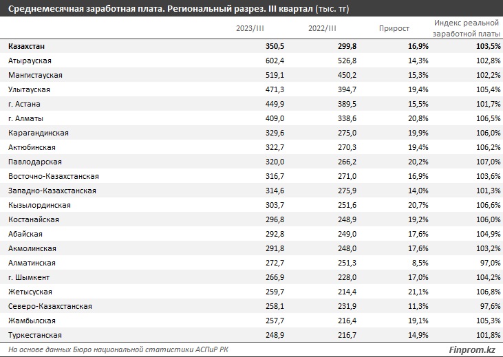 В региональном разрезе наибольшая среднемесячная заработная плата была зафиксирована у жителей Атырауской области: 602,4 тысяч тенге — на 14,3% больше в номинальном выражении и на 2,8% больше в реальном выражении, чем годом ранее.