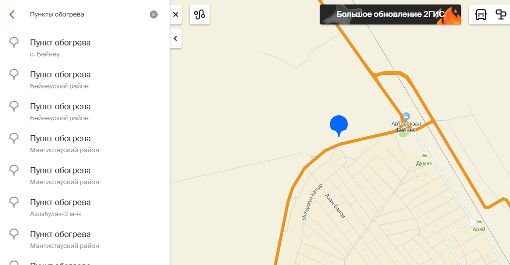 - На трассах Мангистау имеются пункты обогрева и питания в случае ухудшения погоды в регионе. Для удобства автовладельцев, дальнобойщиков мы внесли все пункты обогрева, а также снегозаносимые участки дорог на карту платформы 2GIS. С организациями общественного питания заключены 123 договора-намерения по обеспечению горячим питанием прибывающих из зоны ЧС эвакуированного населения, - сказал начальник управления ликвидации чрезвычайных ситуации ДЧС Мангистауской области, подполковник Дастан Аманкешулы.