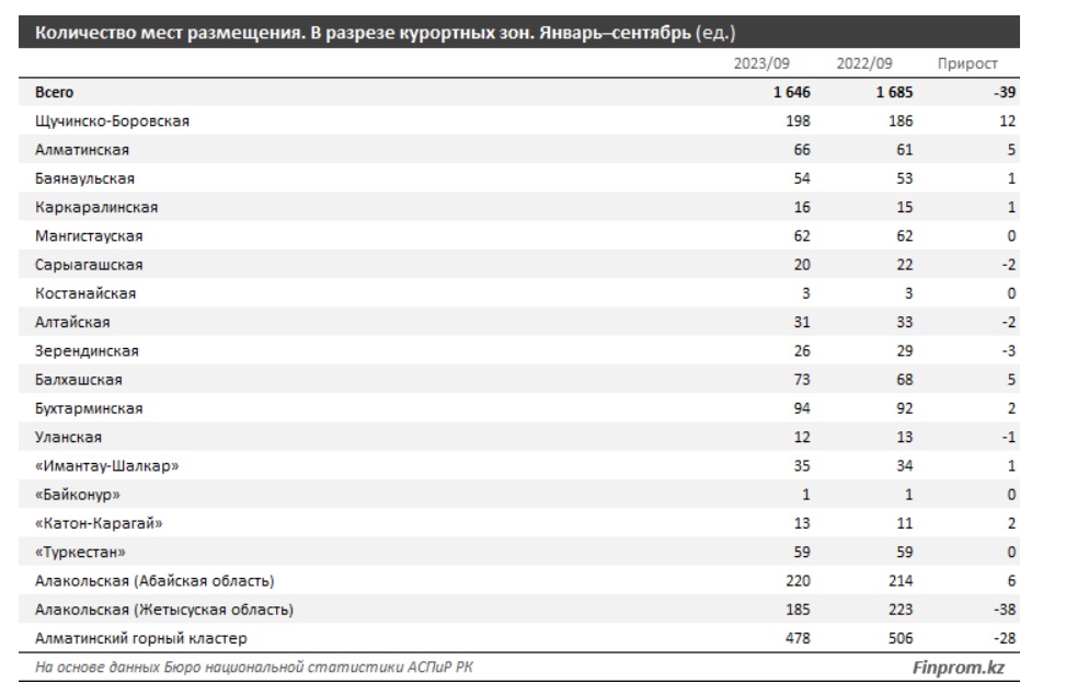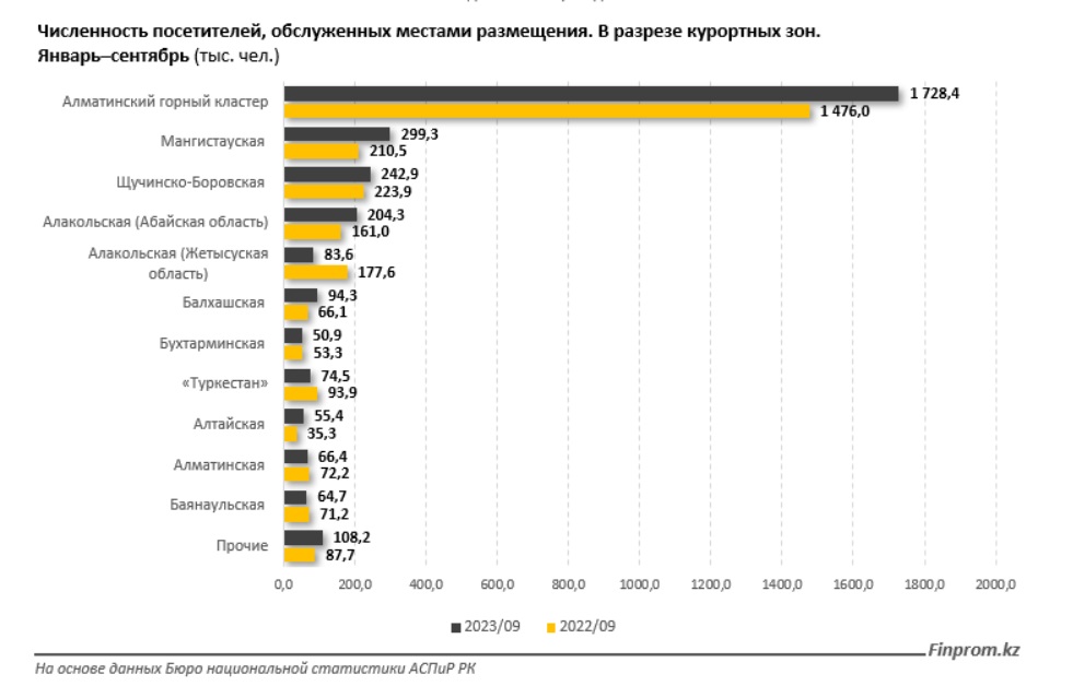 Почти половина всех туристов, останавливавшихся в гостиницах и отелях - чуть более 3 млн человек - в этом летнем сезоне отдыхали в курортных зонах. В стране насчитывается 19 таких зон. Самой посещаемой курортной территорией стал Алматинский горный кластер, где за три квартала 2023 года отдохнули 1,7 миллиона человек.
