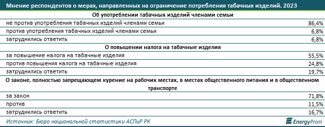 Согласно опросу казахстанцев, 86,4% респондентов не против употребления табачных изделий членами семьи, 6,8% опрошенных против, ещё 6,8% затруднились ответить.