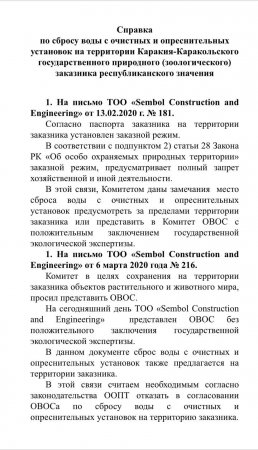 Бывший руководитель управления Комитета лесного хозяйства и животного мира Министерства экологии и природных ресурсов Республики Казахстан, а ныне вице-президент республиканской ассоциации охотников «Табиғат» Айтуар Туганбеков в своих социальных сетях рассказал, что был категорически против проекта сброса очищенной воды из отеля «Rixos» в озеро Караколь. Однако его слушать не стали.