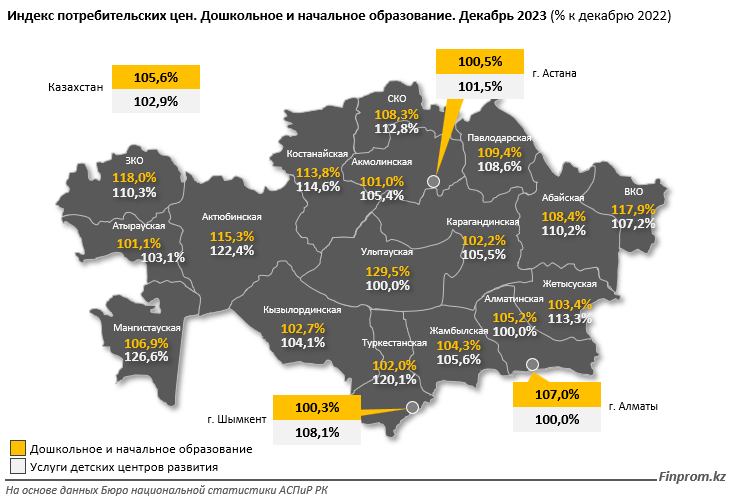 Finprom.kz, в региональном разрезе наибольший рост цен на услуги дошкольного и начального образования был зафиксирован в Улытауской области: плюс 29,5% за год. В тройке антилидеров также оказались Западно-Казахстанская (плюс 18%) и Восточно-Казахстанская (плюс 17,9%) области.