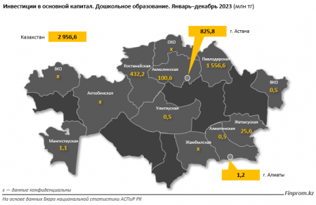 Инвестиции в основной капитал в сфере дошкольного образования за январь–декабрь 2023 года достигли 3 млрд тг, против всего 751,2 млн тг годом ранее. Годовой рост в стоимостном выражении составил 3,9 раза.