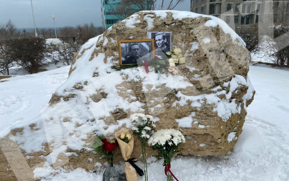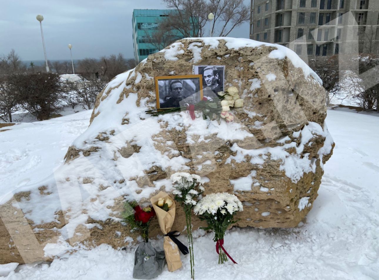 На аллее в 14 микрорайоне на камне неизвестные установили фотографии Алексея Навального и возложили цветы.