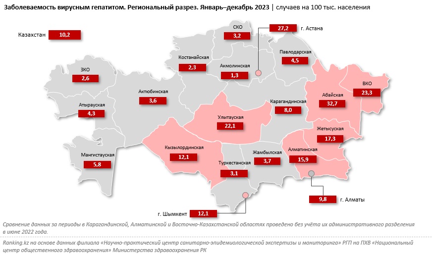 Высокая заболеваемость в прошлом году наблюдалась не на всей территории страны, а лишь в отдельных регионах. В антилидерах оказалась Абайская область, где частота заражения вирусами гепатита была в три раза выше республиканского уровня: 32,7 случая на 100 тысяч населения. Следом идут Астана (27,2), Восточно-Казахстанская (23,3) и Улытауская (22,1) области. В Мангистауской области зафиксировано 5,8 случаев на 100 тысяч населения.