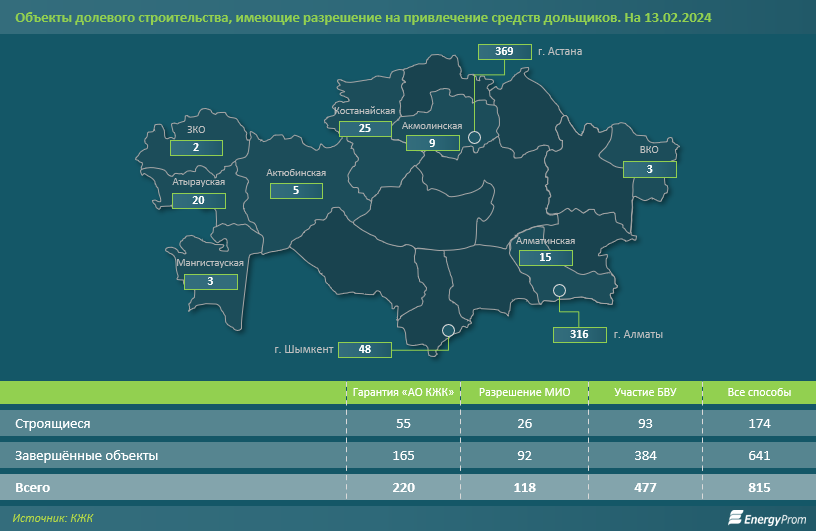 Жилищном портале можно посмотреть список объектов, которые имеют разрешение на привлечение средств дольщиков, то есть гарантировано проверенных и надёжных объектов. Сейчас реестр состоит из 815 таких ЖК, из которых 369 находятся в Астане и 316 — в Алматы, а в Мангистауской области таких разрешений всего три.