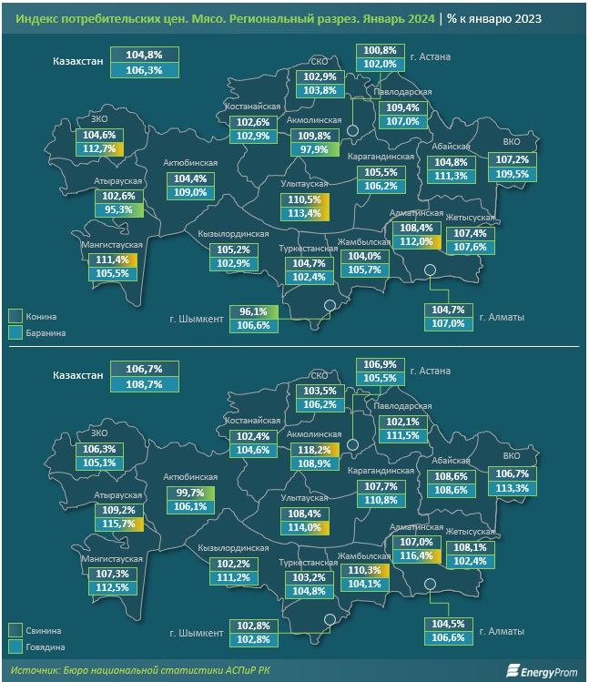 Свинина, в свою очередь, сильнее всего подорожала в Акмолинской (на 18,2% за год) и Жамбылской (на 10,3%) областях.