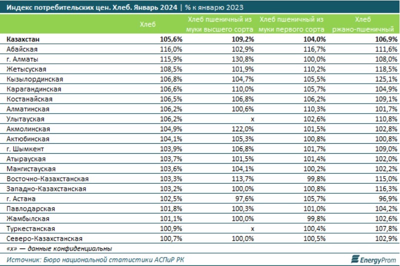 В региональном разрезе наибольший рост цен на хлеб был отмечен в Абайской области: на 16 процентов за год. В тройке антилидеров также оказались Алматы (на 15,9 процента) и Жетысуская область (на 8,5 процента). Наименьшее годовое удорожание было зафиксировано в Северо-Казахстанской (плюс 0,7 процента), Туркестанской (плюс 0,9 процента) и Жамбылской (плюс 1,1 процента) областях.