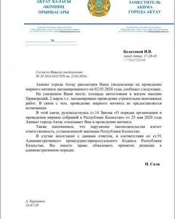 «Акимат города Актау, рассмотрев Ваше уведомление на проведение мирного митинга, запланированного на 02.03.2024 года, сообщает следующее.