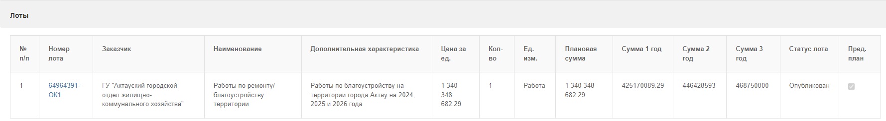 Информацию о проведении конкурса разместили на сайте государственных закупок 1 марта 2024 года. Прием заявок начался сегодня, 4 марта 2024 года. Срок окончания приема заявок – 21 марта 2024 года. Сумма средств, выделенных на услуги по благоустройству территории города, составила 1 340 348 682 тенге на три года.