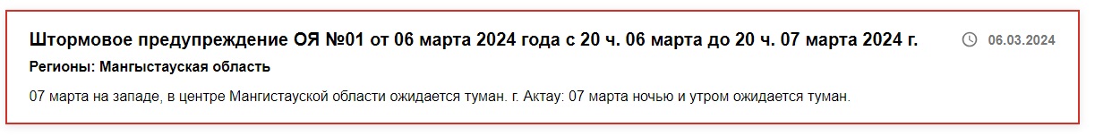 По данным «Казгидромет», накануне праздника, 7 марта, на западе, в центре Мангистауской области ожидается туман. В Актау 7 марта ночью и утром также ожидается туман.