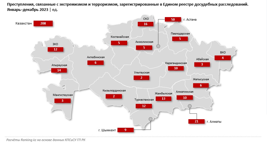 аналитиков, за январь-декабрь 2023 года в Казахстане были выявлены и направлены в суд 122 человека, совершивших преступления, связанные с экстремизмом и терроризмом, против 124 человек годом ранее (минус 1,6%).