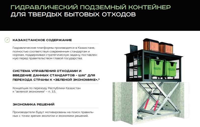 - Бак на гидравлической платформе будет находиться под землей. При установке нет необходимости в специализированной дополнительной технике, переобучении персонала и получении разрешений для работы с манипуляторами. Не требует установки дополнительных элементов (навесы, ограждения, площадки). Очищение мусоросборника будут производиться обычными мусоровозами. Гидравлические платформы производятся в Казахстане, полностью соответствуя современным стандартам и нормам, поддерживая стратегическую задачу, поставленную перед правительством Главой государства. Система управления отходами и введение данных стандартов - это шаг для перехода страны к «Зеленой экономике», - рассказал Данияр Сандыбаев.