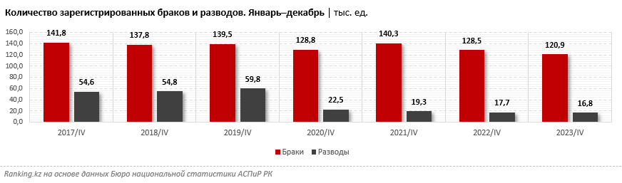 Количество разводов также стало для РК рекордно низким: за двенадцать месяцев прошлого года — всего 16,8 тысяч, на 5,3% меньше, чем годом ранее. В городах число разводов сократилось на 5,2% за год, до 12,4 тысяч, в сёлах — на 5,5%, до 4,4 тысяч пар.
