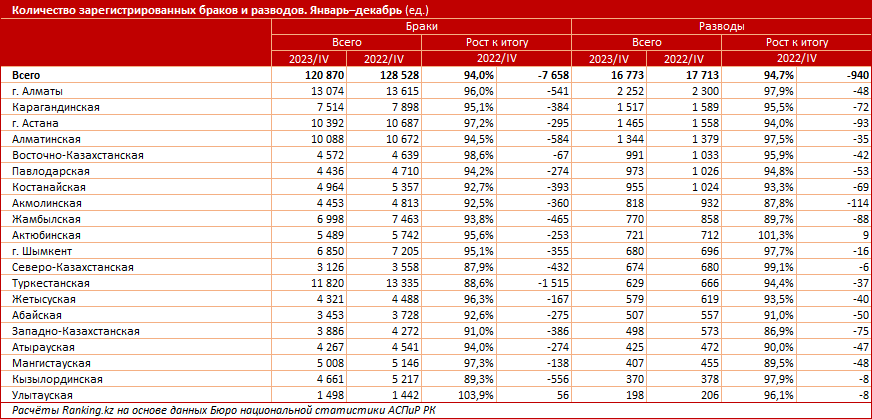 Коэффициент брачности в Казахстане по итогам января-декабря 2023 года сократился с 6,46 до 6,07 на 1000 человек. Самый высокий коэффициент брачности зарегистрировали в столице — 7,46 на 1000 человек. В тройку лидеров также вошли Улытауская и Алматинская области. Наименьший показатель — у Туркестанской области.