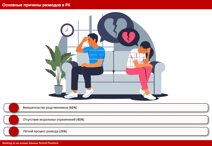 Так, по данным Petrelli Previtera, обновленным 4 марта 2024 года, Казахстан — второй в мире по разводимости, после Мальдив. Коэффициент страны составил 4,6 на 1000 человек. Эксперты отмечают, что основными причинами разводов в стране являются вмешательство родственников (61%), отсутствие моральных ограничений (41%), легкий процесс развода (25%). Также среди проблем — сохранение достаточно жёстких гендерных ролей, что уже не подходит современным казахстанцам и казахстанкам, и в целом изменившееся отношение к браку.