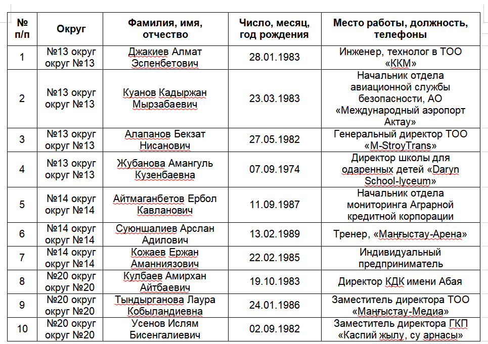 - На выборы было зарегистрировано 4 кандидата по округу №13, три кандидата по округу №14 и три кандидата по округу №20. Избиратели смогут посетить избирательные участки по указанным округам и проголосовать за кандидатов. В настоящее время кандидаты проводят агитационную работу, - сказал председатель Актауской городской избирательной комиссии Ергали Скендиров.