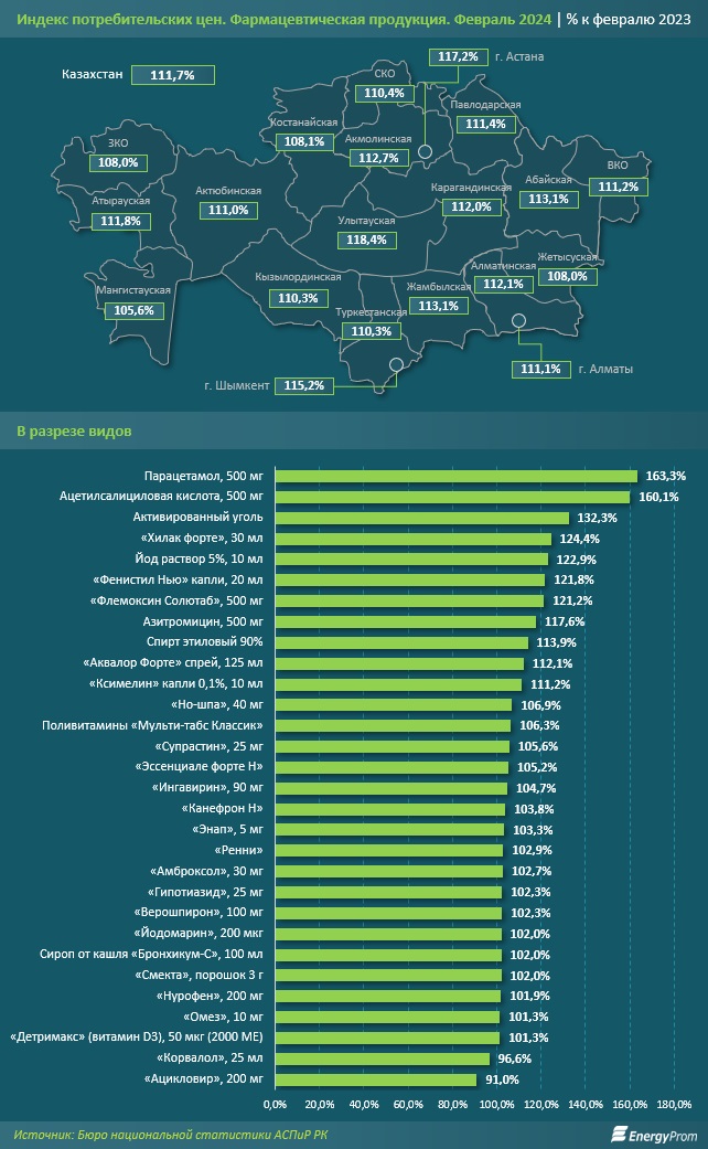 Что касается непосредственно фармацевтической продукции, здесь наибольшее удорожание наблюдалось в Улытауской области: плюс 18,4% в годовой динамике. Среди антилидеров также оказались Астана и Шымкент: плюс 17,2% и плюс 15,2% соответственно. Наименьший рост цен пришёлся на ту же Мангистаускую область: плюс 5,6%.