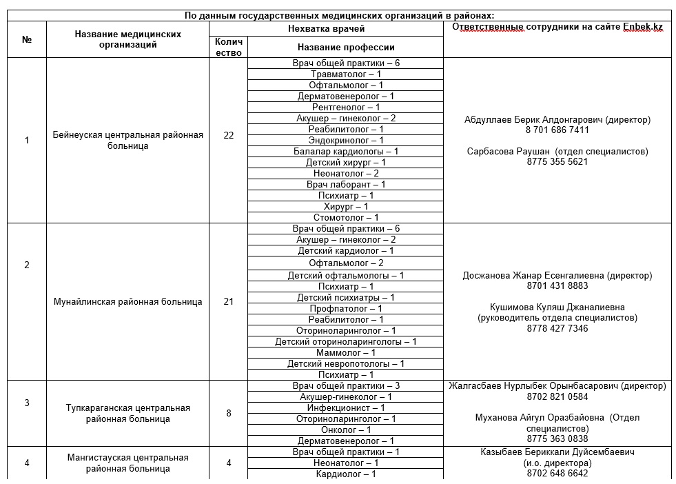 В управлении здравоохранения Мангистауской области сообщили, что в этом году в подведомственных государственных медицинских организациях дефицит врачей составляет 225 единиц. Из них в Актау не хватает 98 врачей, в Жанаозене - 51, в сельской местности - 76.