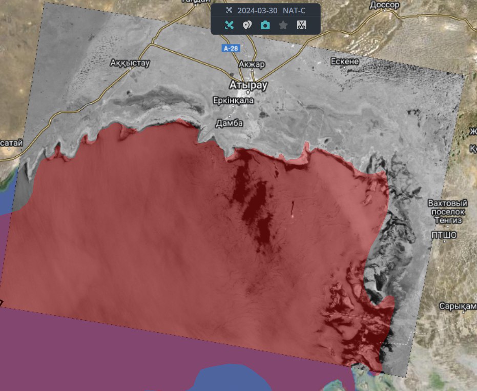 - По данным группы, осуществляющей данный космический мониторинг, «на радиолокационном изображении европейского спутника Sentinel-1A от 30.03 (02:43 UTC) отобразился разлив у казахстанского месторождения и места добычи нефти Кашаган. Площадь разлива – около 7 квадратных километров, пятно дрейфовало на север Каспийского моря, - сообщила она.